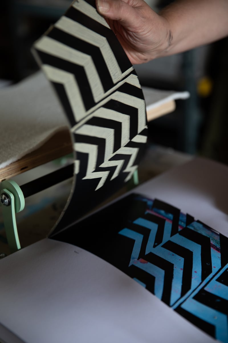 The print is part of a series I created for Dreamland Print Fair, which was being filmed for a TV show. Inspired by Roger Deakins’ cinematography for Empire of Light, I wanted to capture Margate’s iconic architecture, wide horizons and filmic light. The result is a series of semi-abstract monoprints with cinematic quality, which I hope captures the essence of Margate.